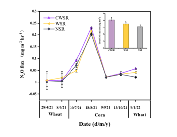 秸秆还田显著影响N2O排放。与不还田(NSR)相比,小麦和玉米秸秆还田(CWSR)以及仅小麦秸秆还田(WSR)的N2O排放总量显著增加了31.74%和12.37%。
