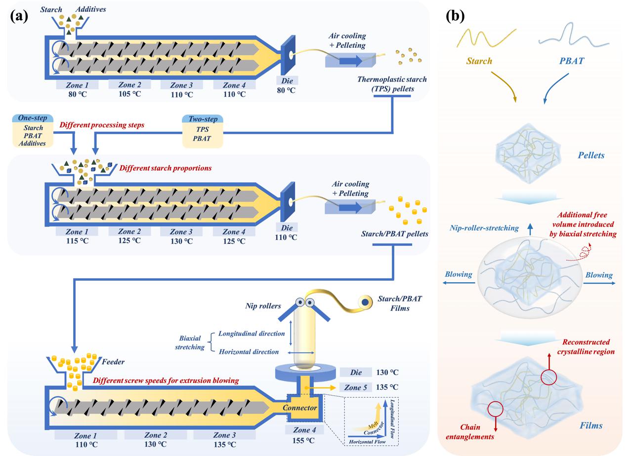 图2 淀粉/PBAT共混成膜的两种典型加工方式及吹塑过程中相分离示意图